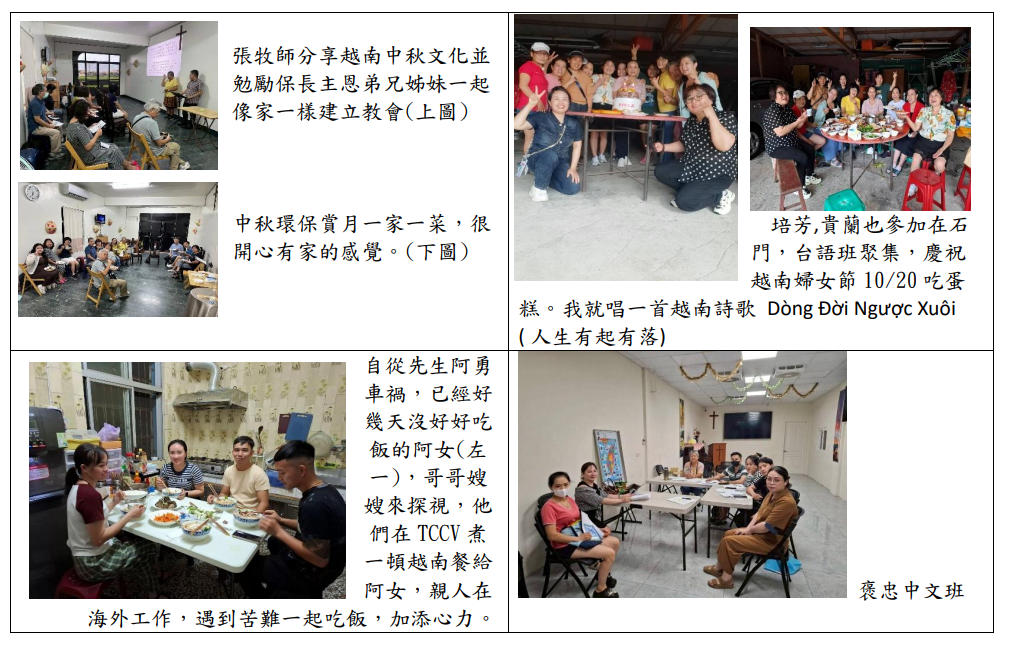 褒忠的越南移工及新住民渴望學中文,十月中開始上課,課程中有配搭中文詩歌及禱告,把天國文化及在地的生活融入越南人中文課程中。北部的線上台語班也選在 10/20婦女節前夕,到石門的鄉下,用豐盛的宴席,邀同學及石門的越南人一起來聚餐。越南人很重視婦女節,先生會請太太吃飯或送禮物,男學生會送女老師花,同事之間也是會在這天男生對女生表示感謝。是一個女生會很期待及開心的日子。