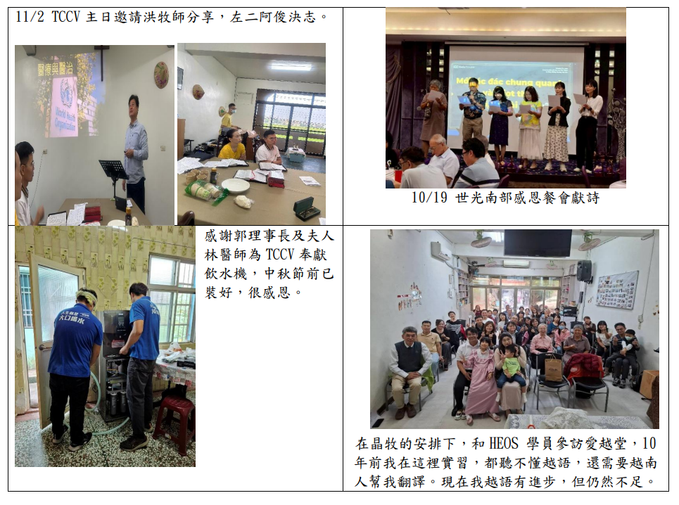 10 月也因為幫助及接待因車禍昏迷的阿勇家人,載他們跑醫院、移民署、警察局、交通大隊,及醫療同意書翻譯。也聆聽阿勇太太阿女的心路歷程。他們在越南就是天主教徒,但來台灣 2 週就逃掉,夫妻成為非法移工,專作農業工人,三年多來都住山上有茶採茶,無茶採梨,山上沒工了,就到平地種蒜。就在來平地第二天,因對路況沒掌握,就和汽車相撞到昏迷,到截稿為止仍未完全清醒,仍需太太灌食翻身換尿布抽痰用氧氣。阿勇他 40 歲有 4 個小孩都在越南就學中,請為阿勇阿女代禱 :1.和肇事者能和解順利且得到大大恩典的理賠。2.阿勇狀況可以恢復到能搭飛機回越南。3.求主繼續安慰鼓勵家人,特別是阿勇的父母及孩子們,求主帶領他們在主裡有盼望。