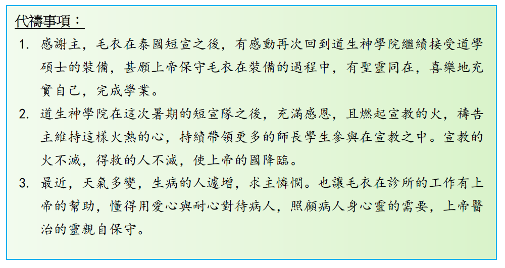 2025年7月底,毛衣跟著道生神學院到泰國曼谷短宣。這是我出隊放手最多的一次;放手不是放心,而是被交代不要管太多!可能加上我八月初還有一隊醫療短宣隊,夠讓我焦慮的,所以我也真的就放手了,大多的時候,做一個觀察、輔佐的角色。