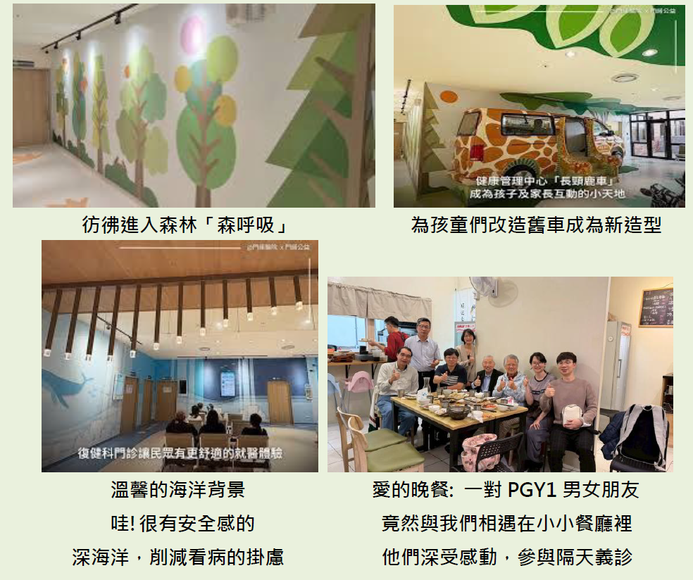 首先,張總執行長就很喜樂的帶我們參觀剛剛新建好、搬移整理大致完成的「健康管理中心」,每一層樓都看出他們的用心:以病人為中心來設計。有海底的世界、有進入森林深呼吸、有舊車新改變成兒童喜愛的、面向太平海洋的美景、腳踏車與行人道、綠蔭盎然的樹木、青翠草地、草坪……美極了!