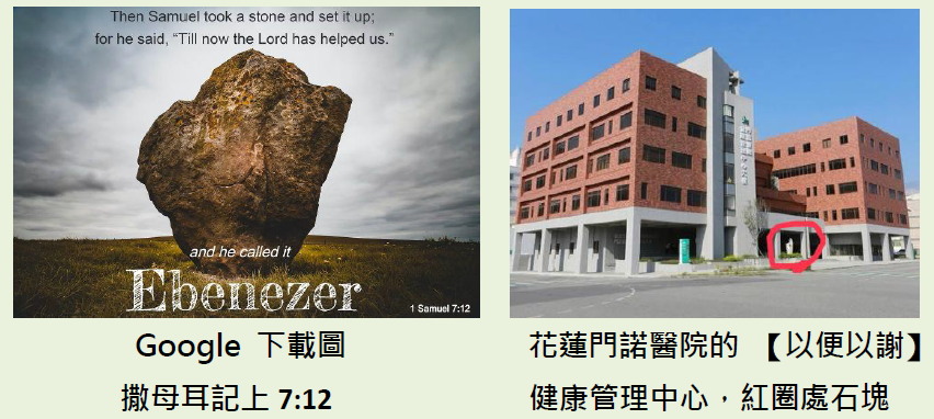 二天一夜的「花蓮門諾醫院之旅」,留在我心深處的就是立在新建好的健康管理中心門前的一塊大石,其上有四個大字寫著:【以便以謝】,意思就是:到如今耶和華都幫助我們。讚美主!祂是全能的主,是我們隨時的幫助,為我們成就大事!聽著總執行長滿懷感恩,訴說祂奇妙作為在門諾醫院,在花蓮地區。